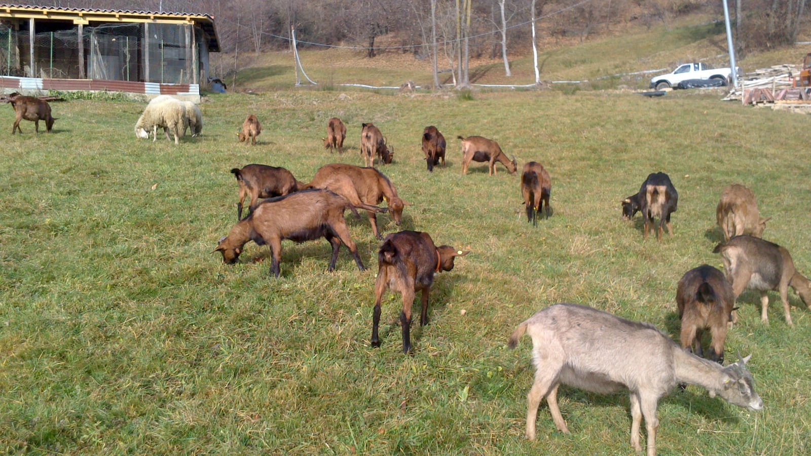 Le capre pascolano liberamente nei boschi che circondano l’abitazione e le pecore brucano l’erba scartata dalle capre (che preferiscono gli arbusti), contribuendo così a tenere puliti i campi. I maiali mangiano, oltre al resto, anche il siero di scolo dei formaggi prodotti.